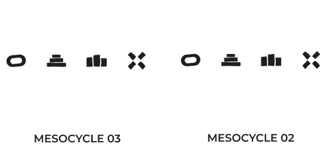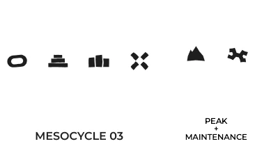 EACH 14-WEEK TRAINING BLOCK IS DIVIDED INTO THREE, FOUR-WEEK MESOCYCLES WITH TESTING AT THE END OF EACH BLOCK TO EVALUATE PERFORMANCE AND SET GOALS FOR THE NEXT CYCLE.